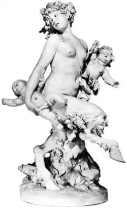 Clodion used the motif in a work which is now in the Walters Art Museum in Baltimore, Maryland: Female Satyr Carrying Two Putti. This satyress is striding upright, carrying a squirming putto in each arm.[4] At least one small terra cotta satyress depicted reclining was created by a student of Clodion in the late 18th or early 19th Century; it resides in a private collection.[5]