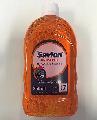 Savlon is a brand of antibacterial personal care products with the active ingredients of cetrimide and chlorhexidine gluconate.[1] Commonly sold as a cream, the product range also includes antiseptic sprays, sticking plasters and other antiseptic products.