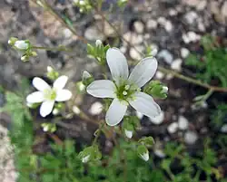 Saxifraga hypnoides, called mossy saxifrage, cut-leaved saxifrage, Dovedale moss, Eve's cushion, Indian moss, lady's cushion, and queen's cushion, is a species of flowering plant in the family Saxifragaceae.[2] It is native to northwestern Europe; Iceland, the Faroe Islands, Norway, Ireland, Great Britain, Belgium, and France, and has been introduced to Czechia, the Eastern Himalayas, and Tibet.[1] In the north of its range a tetraploid form predominates, and in the south a diploid form is more likely to be found.[3]