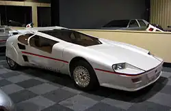 Sbarro also collaborated with Pierre Cardin for a mid-engined, turbocharged version of the Stash released in Paris 1975.[7] While the 109 kW (148 PS; 146 hp), 1.8-litre Volkswagen K70 engine provided impressive performance for the time, Cardin's special interior with its striping, special upholstery, and zip-fastened pockets was the main attraction.[8] All Sbarros have been extremely limited production vehicles - for instance, only five Stash seem to have been built, even though at least three engines, two bodystyles, and the Pierre Cardin special edition were on offer.[9]