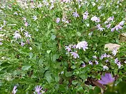 Scaevola albida is a mat forming ground cover growing up to 50 cm (20 in) high and 30–40 cm (12–16 in) wide. The leaves are elliptic to egg-shaped, wavy, bright green, semi-succulent and slightly hairy, 0.6–5 cm (0.24–1.97 in) long, 1–25 mm (0.039–0.984 in) wide, margins smooth or toothed, and sessile. The flowers are borne in upper leaf axils on stems to 25 cm (9.8 in) long, five petaled, corolla white, pale blue or lilac, 5–10 mm (0.20–0.39 in) long with white, more or less flattened hairs on the outer surface. Flowering occurs mostly from October to January and the fruit urn-like shaped, usually one-seeded, papery and 2–4 mm (0.079–0.157 in) long.[2][3][4]