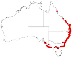 This scaevola is a widespread species growing on sand dunes in coastal locations in South Australia, Queensland, New South Wales and Victoria.[5]