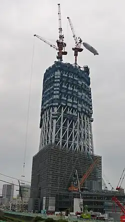 Bamboo scaffolding is a temporary structure to support people and materials when constructing or repairing building exteriors and interiors.[29] In bamboo scaffolding, plastic fibre straps and bamboo shoots are bound together to form a solid and secure scaffold structure without screws.[30] Bamboo scaffolding does not need to have a foundation on the ground, as long as the scaffolding has a fulcrum for structural support.[14]
