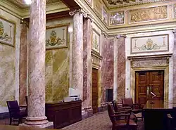 Scagliola (from the Italian scaglia, meaning "chips") is a type of fine plaster used in architecture and sculpture. The same term identifies the technique for producing columns, sculptures, and other architectural elements that resemble inlays in marble.[1] The scagliola technique came into fashion in 17th-century[2] Tuscany as an effective substitute for costly marble inlays, the pietra dura works created for the Medici family in Florence. The use of scagliola declined in the 20th century.[3]