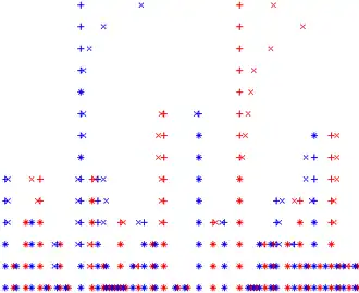 The dendrogram corresponding to the segmentations in the figure above. Each "×" identifies the position of an extremum of the first derivative of one of 15 smoothed versions of the signal (red for maxima, blue for minima). Each "+" identifies the position that the extremum tracks back to at the finest scale. The signal features that persist to the highest scale (smoothest version) are evident as the tall structures that correspond to the major segment boundaries in the figure above.