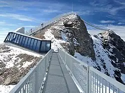 The true summit of the Scex Rouge can only be reached by a bridge connecting it with the subsidiary peak, which is in turn connected to the station by stairs. The 107-metre-long (351 ft) so-called "suspension bridge" (without towers), called Peak Walk, is the world's first suspension bridge which connects two mountain peaks.[2][3] Many of the highest Alpine summits can be seen from the top.