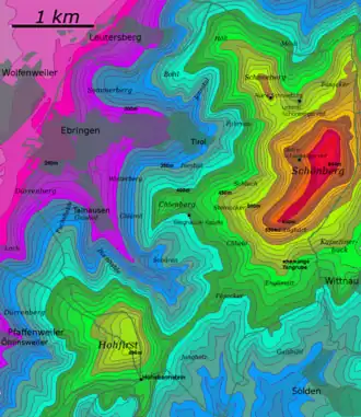 The Schönberg (German pronunciation: [ˈʃøːnˌbɛʁk] ⓘ; earlier known as Schirnberg) is located on the southern outskirts of Freiburg im Breisgau and at 644.9 meters[1] above sea level the Hausberg (a prominent mountain) of the municipality of Ebringen.