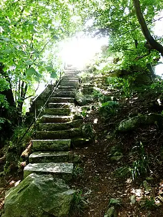 The Scharfenstein is no. 34[2] (Scharfenstein) in the system of checkpoints of the Harzer Wandernadel hiking network. There is a footpath to the summit from the north, from the Eichberg-Süd. From its southern end a narrow stone staircase leads to the top of the spur. From the viewing point here there are views of the Harz, notably the highest mountain, the Brocken. The return path is the same as the spur drops steeply on all sides with the exception of the route to the north.