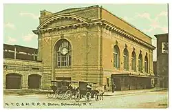 The current station is the third to be built on the site. The original Schenectady Union Station was constructed in 1908 by the New York Central Railroad and the Hudson River Railroad after the railroad grade was raised throughout the city and was in service until it was closed in 1969 by Penn Central due to low ridership and the cost of heating and maintaining the large station. It was replaced with Colonie-Schenectady near NY-155 several miles to the east in Colonie.[3] The Colonie-Schenectady station was a small building with a parking lot. Penn Central then sold the union station building to the city in December 1970 for $20,000. For a brief time there was talk of the station being renovated into an opera house for the Schenectady Light Opera Company but nothing came of the proposal.[4] After its closure, the Union Station was sold by Penn Central to the city of Schenectady in 1970 for $20,000.[5] The Union Station was demolished by the city in 1971 to make way for a parking lot.[5]