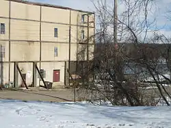 The building's long south facade stretches ten bays as the ground slopes toward the river. All of the south bays feature one over one single-hung sash windows on each story except for bays four, seven and eight, which are windowless. The south facade also features piers with iron buttresses as well as a third bay dock door.[4]