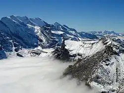 The Schilthorn (2,970 metres (9,744 ft)) is a summit in Europe, in the Bernese Alps of Switzerland. It overlooks the valley of Lauterbrunnen in the Bernese Oberland, and is the highest mountain in the range lying north of the Sefinenfurgge Pass. The Schilthorn lies above the village of Mürren, from where a cable car leads to its summit,[3] holding the record of the steepest cable car in the world.[4]