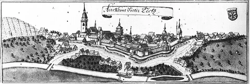 Construction of Kirchheim's complex of fortifications began in 1538,[3][1] and with resources assembled from across the Duchy.[4] This complex was made up deep moats, robust bastions, ramparts, and,[5] at its southwest corner, a castle.[1] This castle was to be the most important part of the complex, acting as a last line of defense and commanding two gates.[6] Ulrich's son and successor, Duke Christoph, completed construction on the complex with the addition of a 75 meters (246 ft) series of casemates called the Erdenberg. This formed a zwinger and base for wall-mounted artillery.[5]