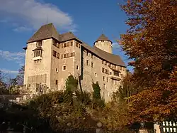 The site of the castle appears on Roman maps of the Antonine Itinerary as Masciacum, a staging post on the major Roman military road between the provinces of Raetia and Noricum.[2] Roman weapons, jewelry, pottery, a fragment of a mosaic and a Roman milestone have been found in its vicinity.[2] The castle stands near two other castles Schloss Lichtwerth (600m) and Schloss Kropfsberg (2000m), reflecting the key strategic importance of the location at the cross-roads of two major valleys offering passage through the Alps. The current edifice dates mostly from the early middle ages, with many later additions.