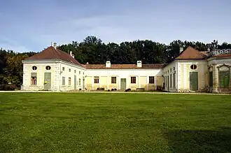 The palace park, an unusual design by Hildebrandt and Maximilian von Welsch, covers an area of approximately 104 hectares, including some ancient trees. The park also features the Nepomuk Chapel, another of Hildebrandt's works. Between 1790 and 1800, Eugen Franz Count Schönborn-Buchheim had an English garden with a large pond laid out in the northern part of the park.[4] A Chinese pavilion on an island served as a shelter.[4] Despite modifications to accommodate a golf course, the park remains one of Austria's most significant garden monuments and is listed under the country's monument protection laws.