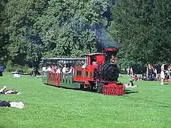 On the occasion of the Bundesgartenschau in 1967, the palace garden was renovated and further developed in the style of an English landscape park. The Schlossgartensee (engl. palace garden lake) was also redesigned and the Schlossgartenbahn (engl. palace garden railway) was put into operation. The original plan was to operate the railway only during the Bundesgartenschau, but it was not dismantled again afterward.