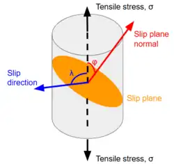 where is the magnitude of the applied tensile stress, is the angle between the slip plane normal and the direction of the applied stress, and is the angle between the slip direction and the direction of the applied stress. This equation can also be expressed in terms of the Schmid factor (), given by[3]