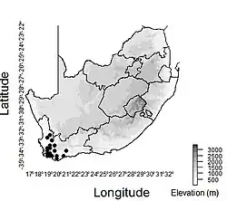 Schoenus bolusii is a species of sedge found in the mountains of the Western Cape Province of South Africa. However, this species is not found on the Cape Peninsula. [1] This species generally occurs on dry sites on coarse soils, but it has been also collected from wet mountain slopes.[1] The reported elevation range of S. bolusii is between sea level and nearly 1000 m.[1]