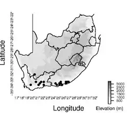 Schoenus megacarpus grows throughout south-central South Africa, with its distribution ranging from the Anysberg Nature Reserve in the west to the Grahamstown area in the east.[1]