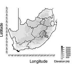 Schoenus prophyllus is found in the southern Agulhas Plain region of South Africa.[1] The preferred growing substrate of this species is limestone. It grows at elevations less than 200 m.[1]