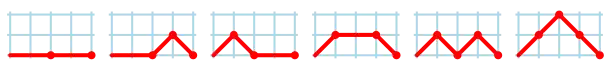 A Schröder path of length is a lattice path from to with steps northeast, east, and southeast, that do not go below the -axis. The th Schröder number is the number of Schröder paths of length .[2] The following figure shows the 6 Schröder paths of length 2.