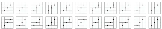 Similarly, the Schröder numbers count the number of ways to divide a rectangle into smaller rectangles using cuts through points given inside the rectangle in general position, each cut intersecting one of the points and dividing only a single rectangle in two (i.e., the number of structurally-different guillotine partitions). This is similar to the process of triangulation, in which a shape is divided into nonoverlapping triangles instead of rectangles. The following figure shows the 6 such dissections of a rectangle into 3 rectangles using two cuts: