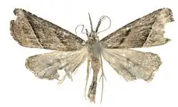 The wingspan is 16–17 mm. The ground color of the forewings is grey brown and the hindwings are ochreous grey.[1]