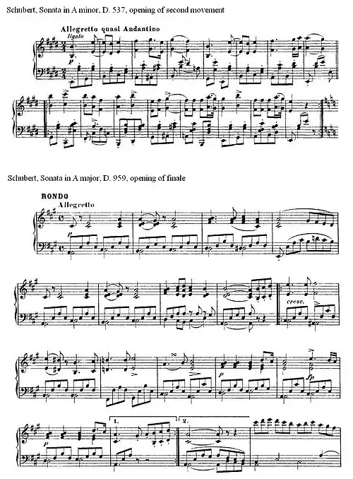 The finale of the A major Sonata, uses as its main theme, a transformation of an earlier theme from the second movement of the Piano Sonata in A minor, D. 537. Schubert introduced some changes to the original melody, which make it conform better with the sonata's basic motifs, in accordance with the cyclical scheme of the sonata.[50] Another allusion to an earlier piano work appears in the middle of the sonata's slow movement: after the climax in the middle section of the Andantino, appears a passage (bars 147–158) that closely recalls bars 35–39 from the Impromptu in G♭ major, D. 899.[51]