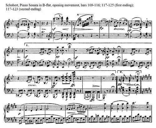 - ^ Brendel, "Schubert's Last Sonatas", pp. 80–84; Schiff, "Schubert's Piano Sonatas", p. 197; Walter Frisch and Alfred Brendel, "'Schubert's Last Sonatas': An Exchange"; Edward T. Cone, Musical Form and Musical Performance, pp. 52–54.