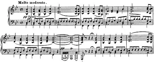 - in the B♭ Sonata, the opening theme of the first movement recalls the opening of Beethoven's "Archduke" Trio, whereas bars 34–39 recall bars 166–169 from the first movement of Beethoven's Fifth Piano Concerto, the Emperor; in the latter case, both passages are similarly modified in the recapitulations.[77] The opening of the sonata's finale, in turn, recalls the opening of the finale from Beethoven's String Quartet in B♭ major, Op. 130.[78]