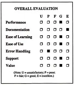 Reviewers would write a section on each category above within the review. A checkbox graphic for each review article allowed readers to see at a glance the reviewer's marks for each of the four categories, giving ratings of Unsatisfactory, Poor, Fair, Good, or Excellent.