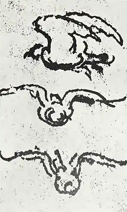 The first examples of Leonardo's studies on anamorphosis can be found both in his treatise Treatise on Painting ("Rules for the Painter")[28] and in the Codex Atlanticus.[27] Two anamorphic drawings of the Codex Atlanticus, representing the head of a baby and an eye, are examples of plane anamorphosis.[29][30] The two drawings can be adjusted when observed from a foreshortening angle, placing the eye on the right side of the sheet, about middle height. The original paper displays a preparation with a bundle of lines traced with a metal tip inside which the figures are inscripted; these lines are invisible in any reproduction.[31][32][33] A chapter in the Codex Arundel 263 (c.62, 9r.) with the title "On natural perspective mixed with accidental perspective" explains how to apply an accidental viewpoint to that of a natural surface, in order for the moving observer to obtain the vision of a "monstrous" figure. This was the procedure used to accomplish the "Fight Between a Dragon and a Lion" and Painting with Horses, so peculiar as to attract the attention of Francis I of France demonstrating the presence of a geometric construction underlying the sketches, which can be seen in their real proportions only observing them with the usual technique needed for ‘anamorphic’ paintings. According to Jurgis Baltrušaitis these are some of the oldest examples of anamorphosis known at the time, and with reference to the technique he stated: