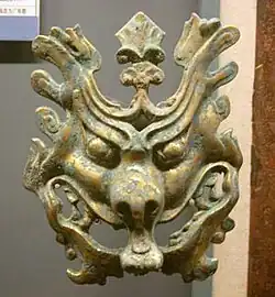 The layout of tombs dug into the sides of mountains typically had a front chamber, side chambers, and a rear chambers designed to imitate a complex of aboveground halls.[138] The tomb of King Liu Sheng (d. 113 BCE) in Hebei province not only had a front hall with window drapes and grave goods, carriages and horses in the southern separate side chamber, and storage goods in the northern side chamber, but also the remains of real timber houses with tiled roofs erected within (along with a house made of stone slabs and two stone doors in the rear chamber).[138] Doors made completely out of stone were found in many Han tombs as well as tombs in later dynasties.[142]