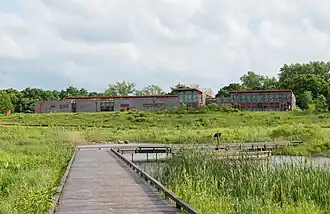 The entire Whittier Peninsula was once home to factories, rail yards, warehouses, and impound lots, and it became an industrial brownfield site.[3] In the early 2000s, Columbus looked to redeveloping its riverfront, as many other cities were at the time. The Whittier Peninsula was proposed to be used for ballparks or an amphitheater. Conservationists helped push for the current park, as the site was being used for birdwatching even then. A three-mile area along the Scioto River still retained its forest and had been recently designated an Important Bird Area. In 2003, Columbus Metro Parks, the Columbus Recreation and Parks Department, and Audubon Ohio signed an agreement to create the park. The city had to remove old buildings and underground storage tanks and pay for soil remediation. Lead and arsenic were concerning, but the five acres around the Audubon center site were not of concern given low levels and contaminants buried deep enough.[1]