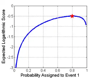 Here, the score is calculated as the logarithm of the probability estimate for the actual outcome. That is, a prediction of 80% that correctly proved true would receive a score of ln(0.8) = −0.22. This same prediction also assigns 20% likelihood to the opposite case, and so if the prediction proves false, it would receive a score based on the 20%: ln(0.2) = −1.6. The goal of a forecaster is to maximize the score and for the score to be as large as possible, and −0.22 is indeed larger than −1.6.