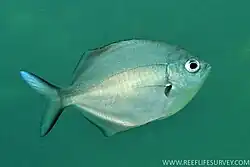 The silver sweep has deep and strongly compressed body with a thin caudal peduncle. The head is moderately sized with an almost straight dorsal profile, a short snout and quite large eyes. The mouth is small and oblique with small but strong teeth in the jaws arranged in broad bands with the outer band being enlarged and recurved. Most of the body is covered in very small ctenoid scales and there is a gently curved lateral line. The dorsal fin continuous with a very short first spine, there are a 10 spines which progressively become higher towards the tail, the first rays in the soft-rayed portion of the dorsal fin is only slightly higher than the spiny portion giving the dorsal fin an almost straight profile. The soft-rayed part of the dorsal fin contains 26-28 soft rays. The anal fin has 3 spines and 27-28 soft rays. The soft portion of the dorsal fin is notably longer than they spiny portion. It has small pectoral fin are small with the uppermost rays being the longest. The pelvic fins are also small and are located below and to the rear of the pectoral fins.[1] Silver sweeps are greyish, blue-grey or green-grey dorsally and silver-grey ventrally, with the edge of the gill cover and the base of the pectoral fin being blackish.[2] This species can reach a length of 30 cm (12 in).[3]
