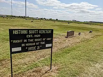 Scott Cemetery is a historic cemetery on Arkansas Highway 91 in southeastern Walnut Ridge, Arkansas. It is a 1.5-acre (0.61 ha) parcel roughly rectangular in shape. There are an estimated 101 burials in the cemetery, although only 30 are marked with burial markers. The oldest marked burial dates to the 1910s. It was established as a burying ground by local African-Americans during the Jim Crow era and includes at least eight graves of known former slaves.[2]