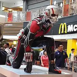 Scott first appeared as the character in Marvel Cinematic Universe (MCU) film Ant-Man (2015).[16] The film depicts Scott as petty criminal who becomes the successor to Hank Pym as Ant-Man, when Pym allows him to "steal" his old suit that allows him to shrink in size but increase in strength.[17][4][18][19] Scott works with Pym and his daughter, Hope van Dyne to take back Pym's company, Pym Technologies, from Darren Cross.[8] To get in shape for the role, Rudd worked with various trainers and cut alcohol, fried foods, and carbohydrates out of his diet.[20] He stated that he "basically didn't eat anything for about a year", comparing his route to that of Chris Pratt.[21]