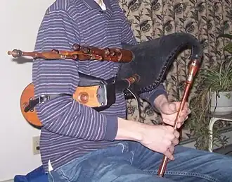 The Scottish smallpipe is a bellows-blown bagpipe re-developed by Colin Ross and many others, adapted from an earlier design of the instrument. There are surviving bellows-blown examples of similar historical instruments as well as the mouth-blown Montgomery smallpipes, dated 1757, which are held in the National Museum of Scotland.[1] Some instruments are being built as direct copies of historical examples,[2] but few modern instruments are directly modelled on older examples; the modern instrument is typically larger and lower-pitched. The innovations leading to the modern instrument, in particular the design of the reeds, were largely taken from the Northumbrian smallpipes.