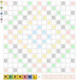 This game is a cross between Othello and Scrabble played on a 13 x13 board.[19][20][21] Each player has different coloured tiles. The rack is common and always contains 7 tiles. All tiles have the same value, one point. Points are scored for how many tiles are currently your own colour. The special squares are pink and orange. A word with a tile on a pink square clears the board. When this happens a bonus point is received for each tile you placed on an orange square on that board.[22][23]