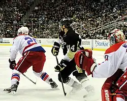 In ice hockey, a screen is obstruction by a player of the goaltender's view of the puck. The word can also be used as a verb, commonly "don't screen the goaltender", or "the goalie was screened". Screens can be both planned, as when an attacking forward positions himself in front of the net, or accidental, like when a defensemen accidentally blocks the goaltender's view. Attacking players may attempt to take advantage of a screen by taking a shot, which is more difficult for the opposing goaltender to save if he is being screened.
