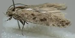 The wingspan is 12–14 mm (0.47–0.55 in).[4] Terminal joint of palpi as long as second. Forewings pale greyish-ochreous, sprinkled with dark fuscous and ochreous-whitish; stigmata dark fuscous, first discal rather beyond plical; a dark fuscous spot close beyond and slightly beneath second discal, sometimes confluent with it; an indistinct fine pale angulated fascia at 3/4, sometimes obsolete. Hindwings 1, whitish-grey, terminally darker. The larva is pale yellowish-green; dorsal line reddish; sides sometimes rosy-tinged; dots blackish-grey; head pale brownish-ochreous; plate of 2 blackish-brown.[5][6][7][8]