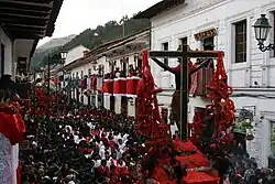Señor de los Temblores (in Quechua known as Taytacha Temblores, meaning Christ or Lord of the Earthquakes) is a late 16th-century statue of the crucifixion of Jesus in Cusco Cathedral in Cusco, Peru. It is popularly believed to have reduced damage in the city during the 1650 earthquake.[2] Taytacha Temblores became known as the patron of Cusco,[3] and is carried in procession annually on Holy Monday. It is one of the most well-known sculptures in present-day Peru, and is represented in hundreds of paintings.