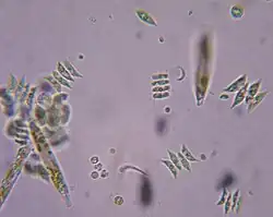 Because of the shallow waters, the development of aquatic life in the Sea of Azov is more characteristic of a lagoon, and the plankton patterns are rather similar in the open sea and near the shores. Despite its shallowness, the water has low transparency, so bottom plants are poorly developed and most algae are of planktonic type. The sea is characterised by high concentrations of organic matter and long blooming periods. Another specific feature of the sea is the variable salinity – low in the large bays and higher in the open sea, especially near the Kerch Strait. Therefore, the plankton species are distributed inhomogeneously in the Sea of Azov. Although many additional species are brought in from the saltier Black Sea, most of them cannot adjust to the variable salinity of the Sea of Azov, except for the euryhaline species.[62] About 600 species of planktonic algae are known in the Sea of Azov.[59] The number of species is dominated by diatoms and green algae; blue-green algae and pyrophites are significant, and euglena and yellow-green algae form only 5% of the species. Green algae are mostly responsible for the colour of the sea in the satellite images (see photos above).[62]