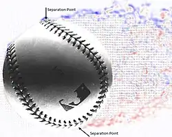 The Utah State group showed that Major League Baseball (MLB) baseball seams, when in specific locations relative to the direction of the ball, force the boundary layer to separate earlier (closer to the front of the ball) than it normally would. If this occurs on one side of the ball and not on the opposite side, a net force is produced. This force can be similar in magnitude to that caused by spin (i.e. the Magnus effect).[1]
