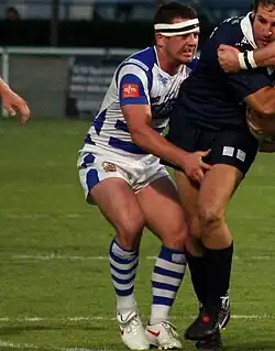 He has played at club level in the Super League for Halifax (two spells, including the second in the Championship), the Huddersfield Giants, in the Championship for the Leigh Centurions,[4][5] in the inaugural 2017 season for the Toronto Wolfpack, and for Workington Town in Betfred League 1, as a stand-off, scrum-half or hooker.[2]