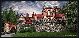 The Searles Castle is located in Windham, New Hampshire, in the United States. Edward Francis Searles commissioned its design and construction. Construction began in 1905 and was completed in 1915. It was intended to be a 1/4-scale replica of the medieval Tudor manor of Stanton Harcourt in Oxfordshire, England, but since most of the manor had been torn down in the 18th century, the castle bears little resemblance to the historical structure.[1]