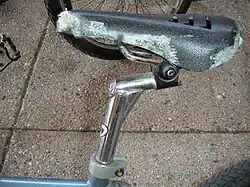 A bicycle seatpost,[1] seatpin,[2] saddlepole,[3] saddle pillar,[4] or saddle pin[5] is a tube that extends upwards from the bicycle frame to the saddle. The amount that it extends out of the frame can usually be adjusted, and there is usually a mark that indicates the minimum insertion (or maximum extension). Seatposts can be made of steel, aluminum, titanium, carbon fiber, or aluminum wrapped in carbon fiber.[6]