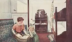 Accommodation for third-class was located in the least desirable parts of the ship, where passengers were subject to the noise and vibrations of the engines.[20] These were on the lower decks at either end of the ship. Single men were housed in the bow while single women and families were accommodated in the stern section, with families occupying the larger cabins. Cabins were spacious by the standards of the time but often irregularly shaped, to conform with the curvature of the ship's stern and bow sections.[3] They were panelled in white-painted pine with salmon pink coloured linoleum floors, mattresses and White Star bed linens (the only exception was single men, who were provided with only straw-stuffed mattresses and a blanket).[3] Only the cabins for families and single women were furnished with washbasins. The freshwater was stored in wall-mounted enamelled tanks which had to be manually filled by a steward. The wastewater from the basin would drain into a tank below, which the steward would drain by opening a sluice valve.[21] In contrast to first and second class, there were only two baths to serve the more than 700 third-class passengers on board at any one time.[22]