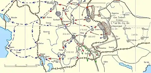 The objectives of the Bulgarian Second Army were to cut the communication and supply lines between Macedonia and Serbia, to prevent a retreat of the main Serbian forces to Macedonia and to repel any Entente attempts to reinforce the Serbians from the south.