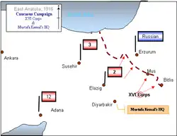While the XVI Corps commanded by Mustafa Kemal had success at Bitlis and Mus, the main attacks by the III and IV Corps suffered heavy losses. The Army lost about 30,000 out of 100,000 soldiers. The divisions suffering the losses were both veteran units and the best of the newly created divisions. The Ottoman Army could not afford to lose such men for meaningless gains. As a result, the offensive was a major strategic defeat.[12] It was the last major strategic offensive by the Ottomans in the war.